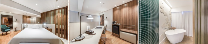 Fully renovated, the Premium Suite has 45m² and is located on the 22nd and 23rd floors. The new accommodation features a Smart TV, cable TV, Wi-Fi, air conditioning, special amenities, professional hairdryer, minibar, espresso coffee maker with four complimentary sachets, safe, iron and ironing board, and two complimentary water bottles per stay. The same accommodation features a private bathtub with a TV facing the same room, as well as bathrobes and slippers.